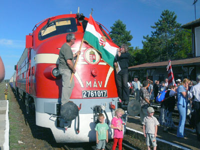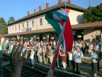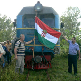 és Oroszi József polgármesterA pár percre lévő szlovák-ukrán határon szokatlan állapot fogadott. A szlovák oldalon ugyanis nem településen, hanem a nyílt pályán felállított őrbódénál történt a schengeni határellenőrzés. A két országot ukrán részről ma is elválasztó nyílegyenes szögesdrót, valamint gereblyézett határsáv elhagyása után futott be a szerelvény Csap pályaudvarára. Az elmaradhatatlan ünnepi fogadtatás után kissé lejjebb hagyott a lelkesedés, amikor a Beregszászig tartó harminc kilométer megtételéhez másfél óra kellett, ám még ennek a csigalassúságnak is volt előnye: hosszabban integethettek egymásnak az út menti települések és a szerelvény magyarjai.